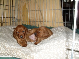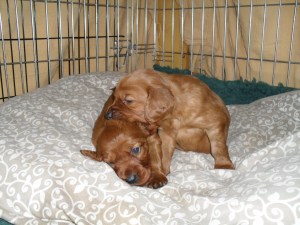 Afgelopen zaterdag had de eerste pup ontdekt dat hij uit de werpkist kon klimmen en als er een schaap over de dam is… Zondag klommen ze er alle vier uit, dus was het de hoogste tijd om te pups te verhuizen naar de puppie-ren. De bench gebruiken ze om te slapen en de ren om te spelen.