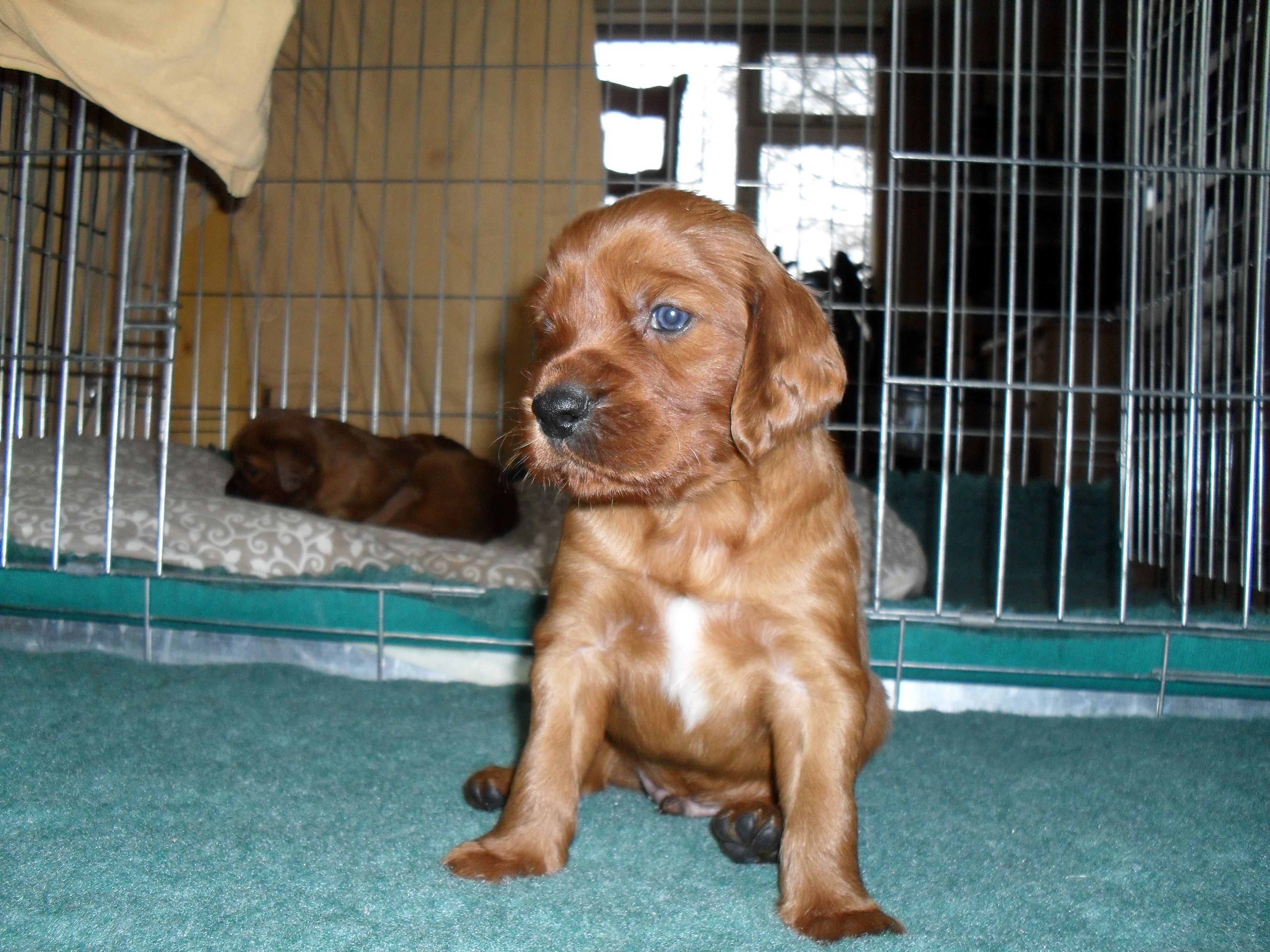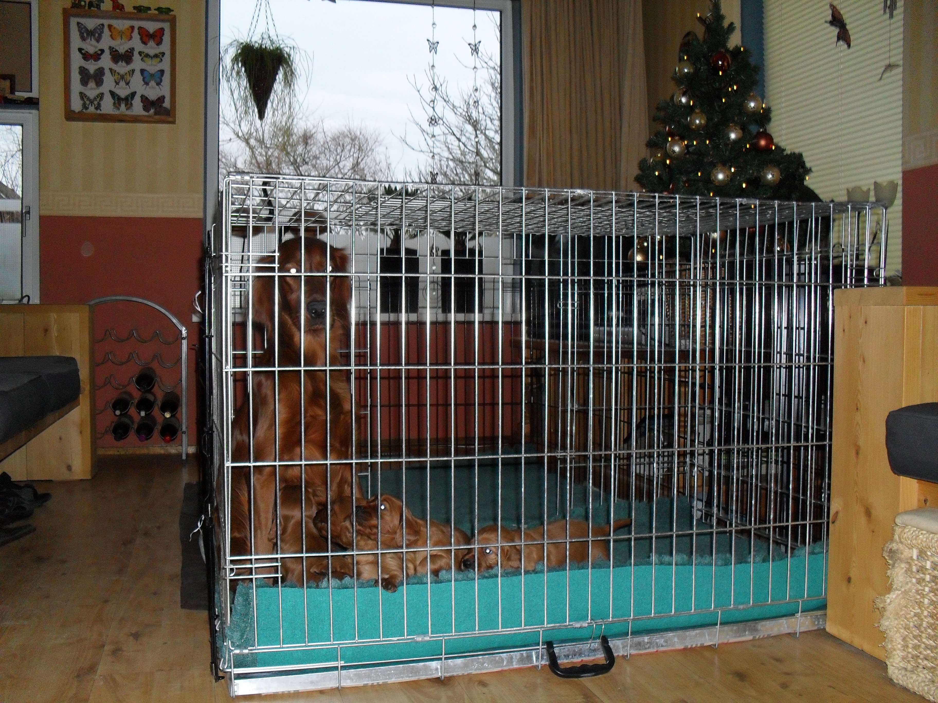 Afgelopen zaterdag had de eerste pup ontdekt dat hij uit de werpkist kon klimmen en als er een schaap over de dam is… Zondag klommen ze er alle vier uit, dus was het de hoogste tijd om te pups te verhuizen naar de puppie-ren. De bench gebruiken ze om te slapen en de ren om te spelen.